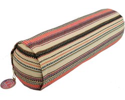 Het grote onderscheid zit in de boekweitvulling: in tegenstelling tot schuim of kapok past boekweit zich licht aan je lichaamscontour aan maar behoudt zijn vorm goed. Dat geeft een vaste, stabiele ondersteuning die je bij schuimbolsters minder vindt. De katoen buitenhoes ademt goed en heeft een authentieke, handgemaakte uitstraling dankzij het meerkleurige bohemian patroon. De ronde vorm (diameter 16 cm) is geschikt voor rugopeners, heupopeners en pranayama posities.