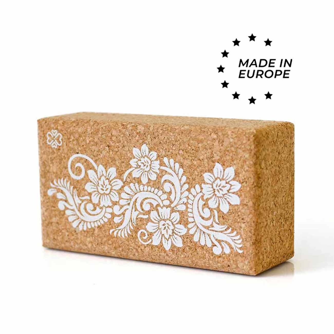 Stevig yogablok met witte bloemen print, 100% Portugese kurk biologisch afbreekbaar, gemaakt uit 1 stuk zonder lijm. Duurzaam, natuurlijk en geschikt voor alle yogastijlen.