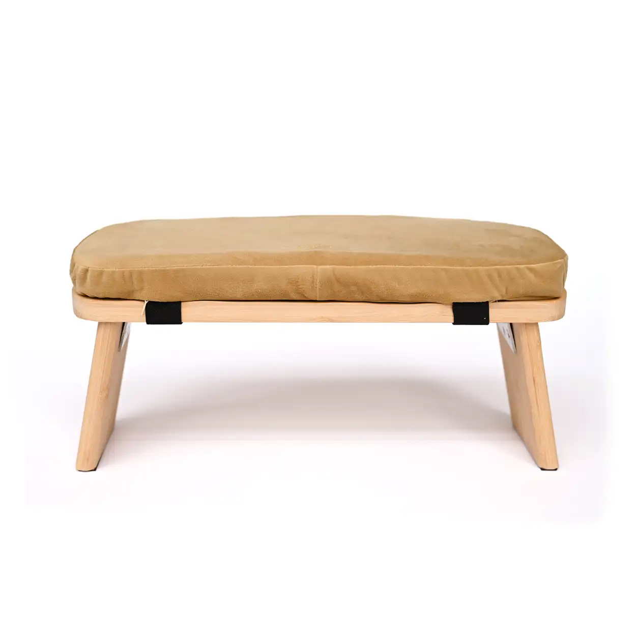 Meditatiebankje van bamboe met luxe fluwelen zit kussentje in de kleur Goud Geel. Inklapbaar, Stevig & Duurzaam. Makkelijk op te bergen in de gratis draagtas.