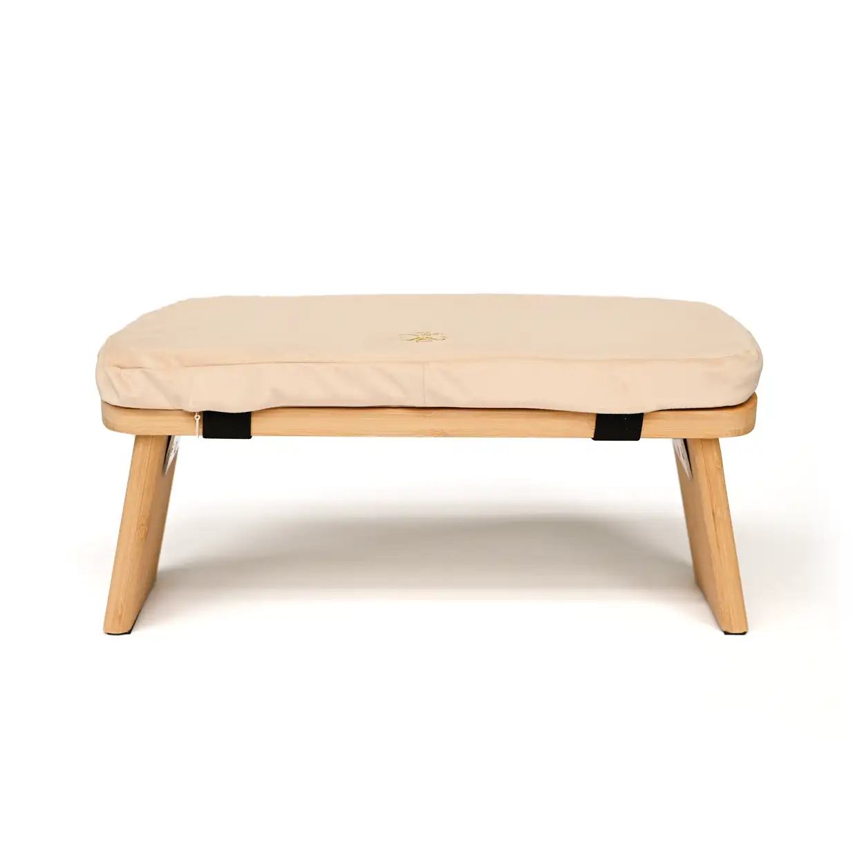 Meditatiebankje van bamboe met luxe fluwelen zit kussentje in zandkleur. Inklapbaar, Stevig & Duurzaam. Makkelijk op te bergen in de gratis draagtas.