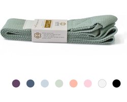 De katoenen constructie onderscheidt deze draagriem van goedkopere nylon alternatieven: katoen voelt zachter aan op de schouder en is minder geneigd te snijden bij langere dragertijden. De Serenity Sage kleur — een rustgevende saliegroen tint — past perfect bij de esthetiek van veel yogamatten en -accessoires. Bovendien is de riem verstelbaar, waardoor hij geschikt is voor matten van verschillende diktes en formaten.