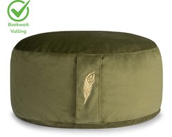 Het kussen valt direct op door de groene velvet bekleding en de dubbele stiknaad die zorgt voor extra duurzaamheid en een nette afwerking. De afmetingen van 15 cm hoogte bij 33 cm diameter zijn bewust gekozen: hoog genoeg om de heupen boven de knieën te houden — essentieel voor een ontspannen zithouding — zonder dat het onhandig groot wordt. Eco-materialen sluiten bovendien goed aan bij de yogawaarden van veel beoefenaars.